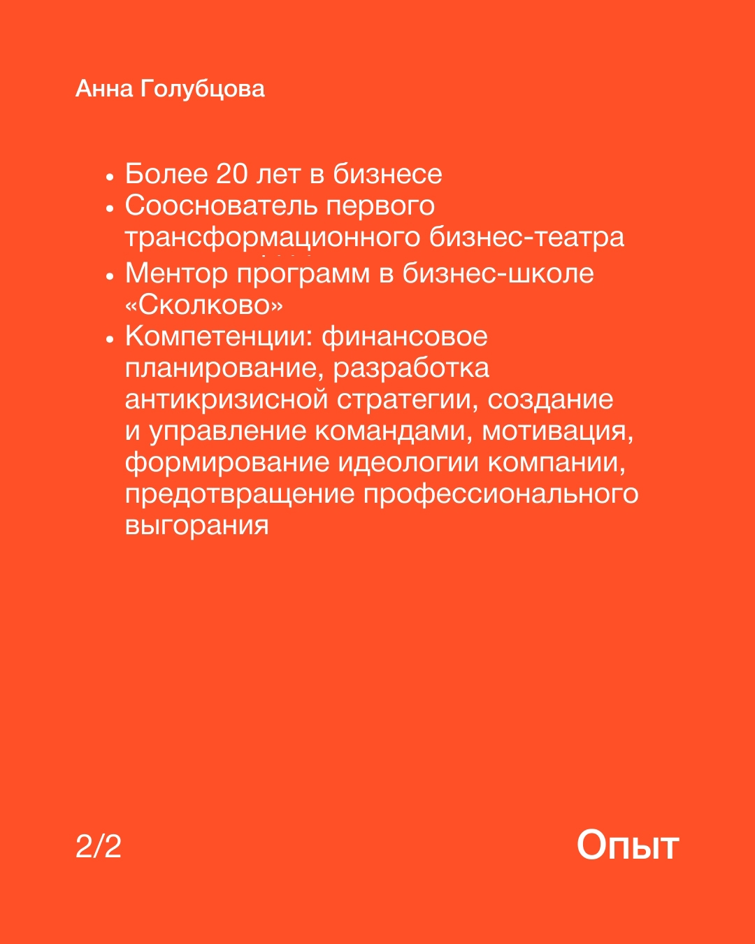 Анна Голубцова является учредителем и управляющим собственником мебельной торгово-производственной компании Arnika, имеет богатый опыт в финансовом планировании, разработке антикризисной стратегии, создании и управлении командами, мотивации, формировании идеологии компании, предотвращении профессионального выгорания.